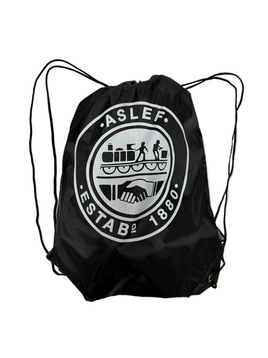 Eco-friendly black drawstring bag with ASLEF logo in white on the front. Made from recycled plastic bottles. Size: 36 x 40 cm.