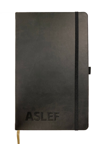 Moleskine notebook with 'ASLEF' embossed in letters on the front. Lined pages, bookmark ribbon, pen loop and elastic elastic strap for keeping the contents secure. Also has an expandable pocket on the inside-back cover. Size: 13cm wide and 21cm high.