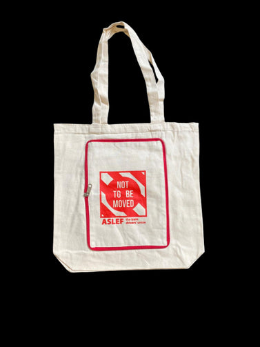 100% cotton cream tote bag with red 'NOT TO BE MOVED' ASLEF logo. Large front pocket. The bag folds into the pocket and can be zipped up.